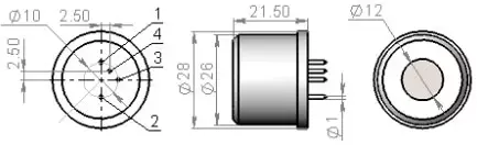 Электрохимический сенсор 4Е-H2S состоит из 3 электродов – рабочего, сравнительного и вспомогательного, размещённых на подложке в корпусе датчика. Электроды покрыты специальным катализатором, участвующим в электрохимической реакции. Между электродами находится слой электролита, который обеспечивает проводимость ионов во время обнаружения газа. Такая конструкция сенсора снижает влияние помеховых газов и позволяет проводить более точные и стабильные измерения.