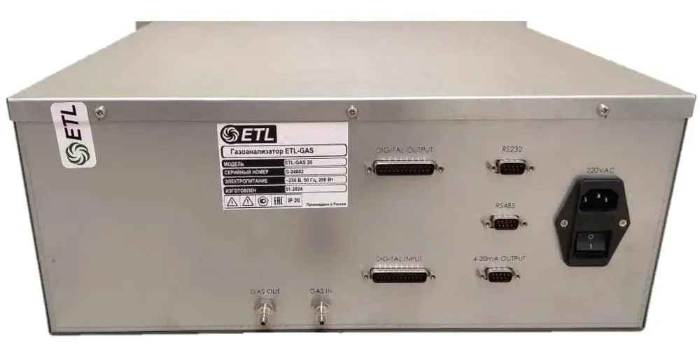 Газоанализаторы ETL-GAS являются одноблочными, устанавливаются в стойку. Во внутреннем пространстве корпуса размещены все необходимые компоненты: измерительный датчик, блок питания, процессор и газовые линии.