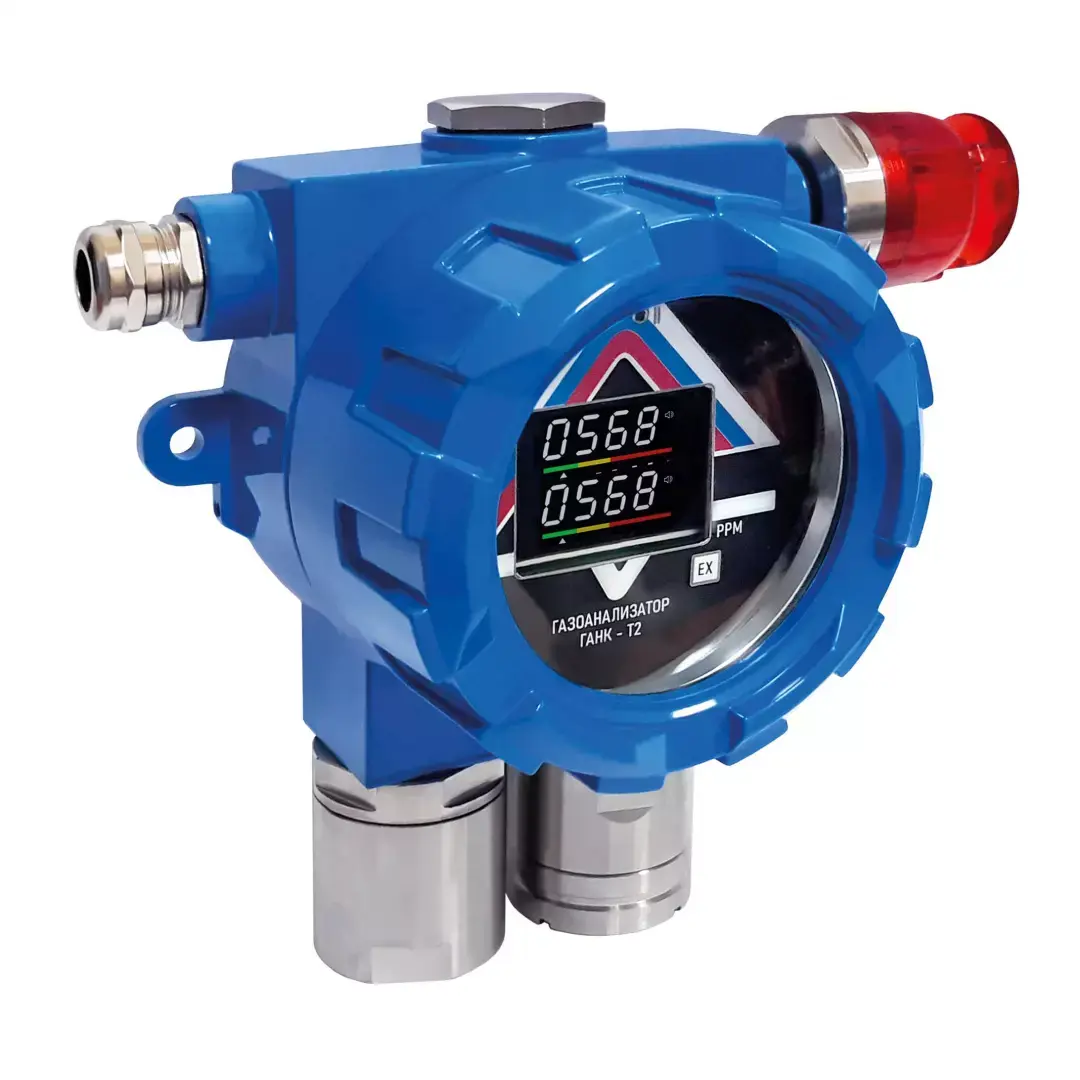 Газоанализатор имеет взрывозащищённое исполнение. Корпус пылевлагонепроницаем, выполнен из алюминиевого сплава или нержавеющей стали. На верхней поверхности корпуса расположены контрастный LED-экран и светодиодные индикаторы, на боковой поверхности - отверстия для подключения внешних цепей и дополнительного сигнального устройства. В составе прибора ГАНК-Т2 используются высокочувствительные электрохимические сенсоры.
