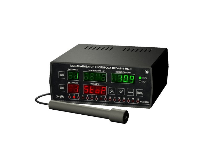 Восьмиканальный прибор предназначен измерения и регулирования концентрации кислорода одновременно по восьми каналам. Используется для определения состава воздуха рабочей зоны одновременно в нескольких помещениях (производственных, складских или жилых), а также содержания кислорода одновременно в нескольких газовых магистралях с последующей передачей данных на один компьютер.