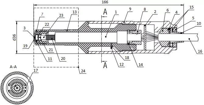 1 - внутренний корпус; 2 - плата предусилителя; 3 - мембрана; 4 - кольцо; 5 - гайка; 6 - кольцо уплотнительное; 7 - накидная гайка; 8 - гайка; 9 - кожух; 10 - втулка; 11 - втулка; 12 - пробка; 13 - основной корпус; 14 - кольцо уплотнительное; 15 - шайба; 16 - кабель связи с БИ; 17 - компенсатор; 18 - отверстие для заливки электролита; 19 - платиновый катод; 20 - серебряный анод; 21 - фторопластовая плёнка; 22 - нитки капроновые; 23 - держатель электродов; 24 - погружная часть.