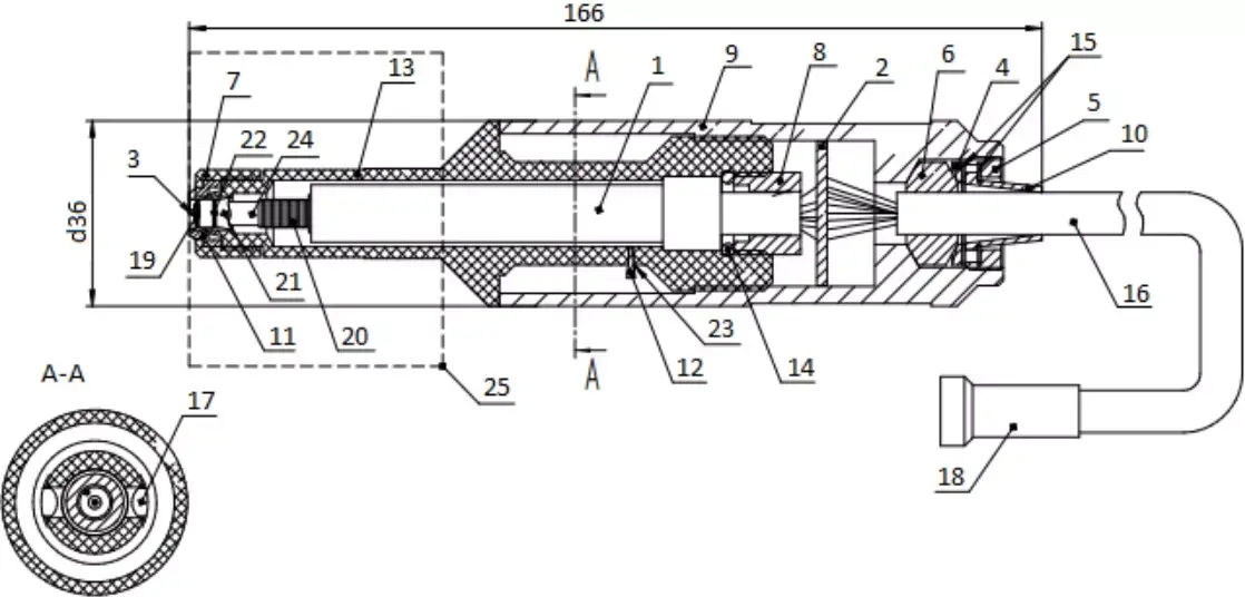 1 - внутренний корпус; 2 - плата предусилителя; 3 - мембрана; 4 - кольцо; 5 - гайка; 6 - кольцо уплотнительное; 7 - накидная гайка; 8 - гайка; 9 - кожух; 10 - втулка; 11 - втулка; 12 - пробка; 13 - основной корпус; 14 - кольцо уплотнительное; 15 - шайба; 16 - кабель связи с БИ; 17 - компенсатор; 18 - разъём для подключения к БИ; 19 - платиновый катод; 20 - серебряный анод; 21 - фторопластовая пленка; 22 - нитки капроновые; 23 - отверстие для заливки электролита; 24 - держатель электродов; 25 - погружная часть.