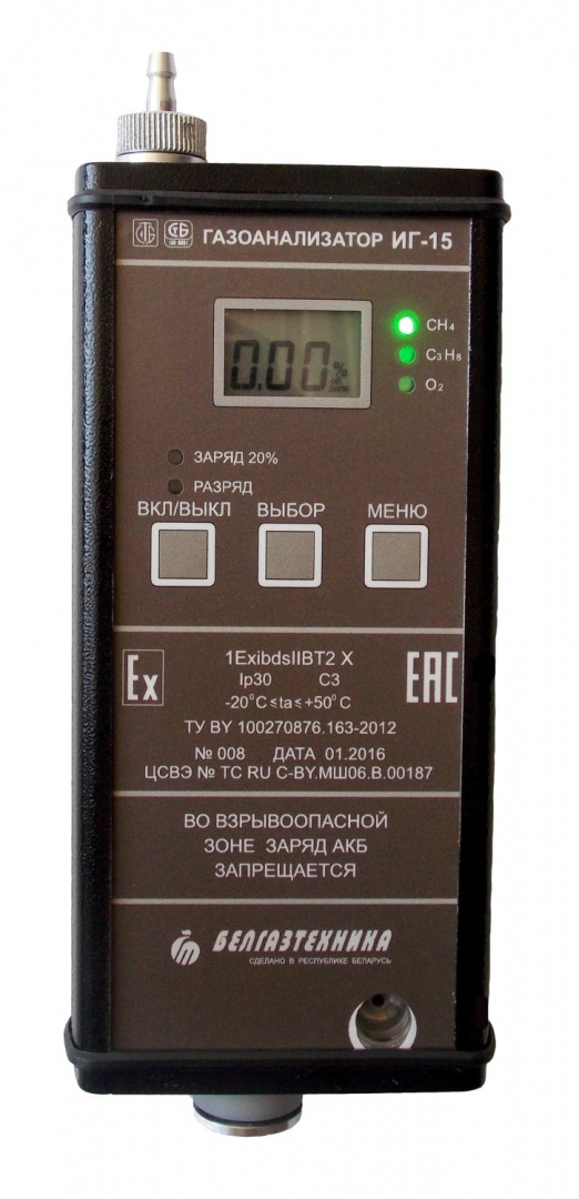 Серийно производимый переносной взрывозащищённый газоанализатор ИГ-15 применяется для контроля метана, пропана и кислорода, а также подачи световых и звуковых сигналов при превышении предельных значений.