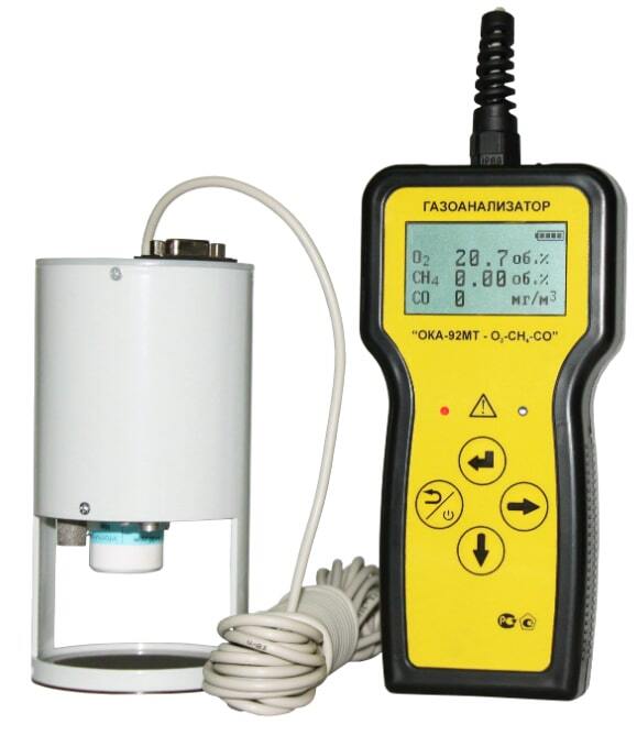 - ОКА-92МТ (O2, CH4, CO) переносной газоанализатор кислорода, горючих и токсичных газов с калибровкой по метану и угарному газу с выносным блоком датчиков на кабеле 6 метров, исполнение общепромышленное;