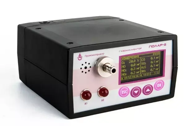 Серийно производимый переносной многокомпонентный газоанализатор Полар-2 применяется для измерения в воздухе концентрации кислорода, взрывоопасных и токсичных газов, а также подачи световой и звуковой сигнализации при превышениях допустимых концентраций.