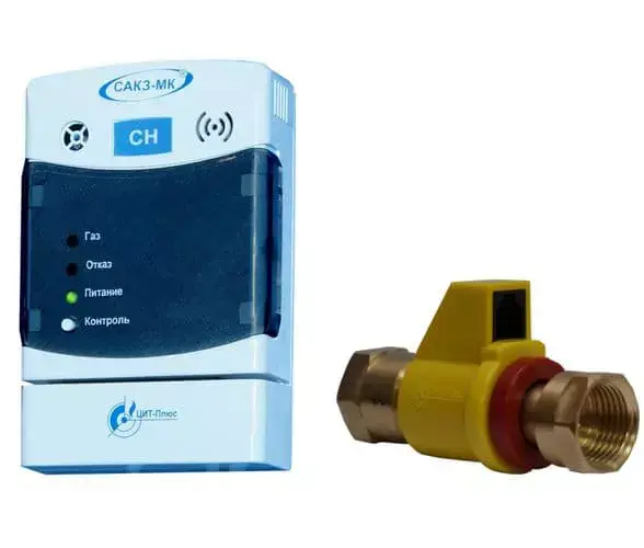 - САКЗ-МК-1 состоит из сигнализатора загазованности в ударопрочном пластмассовом корпусе, запорного клапана с импульсным управлением и кабеля клапана протяжённостью 10 м (по заказу до 20м);