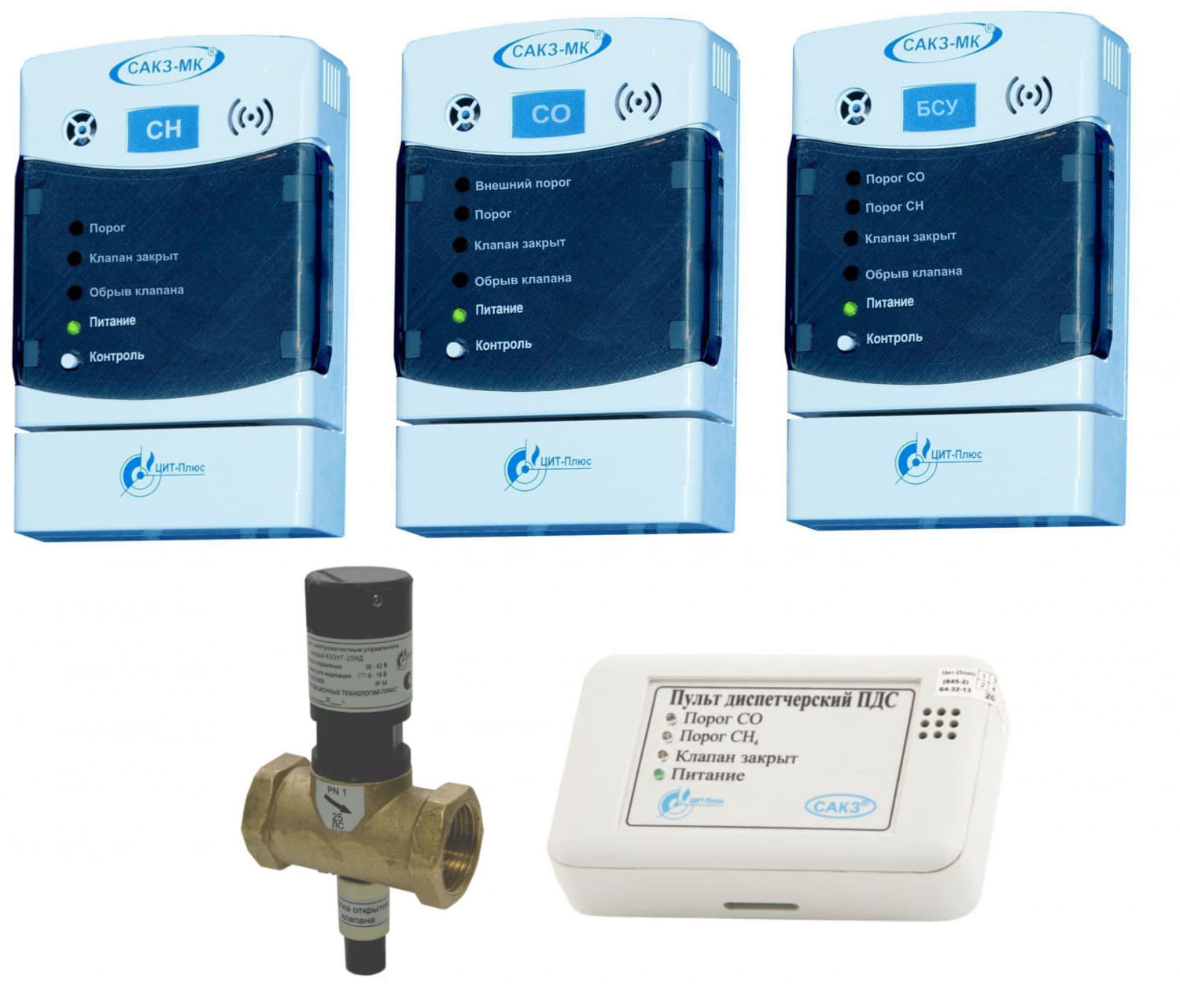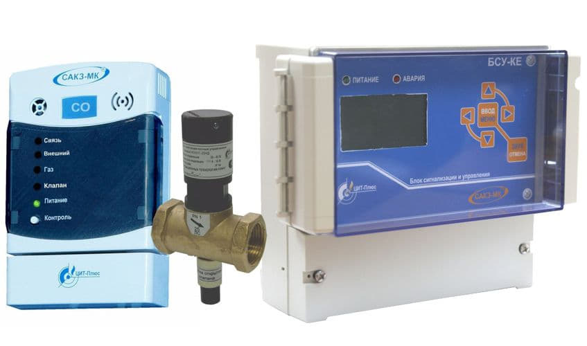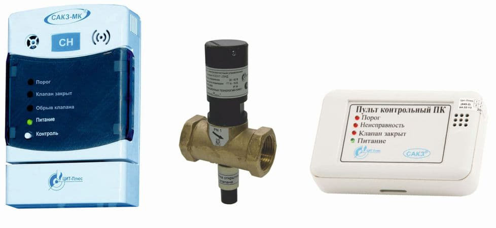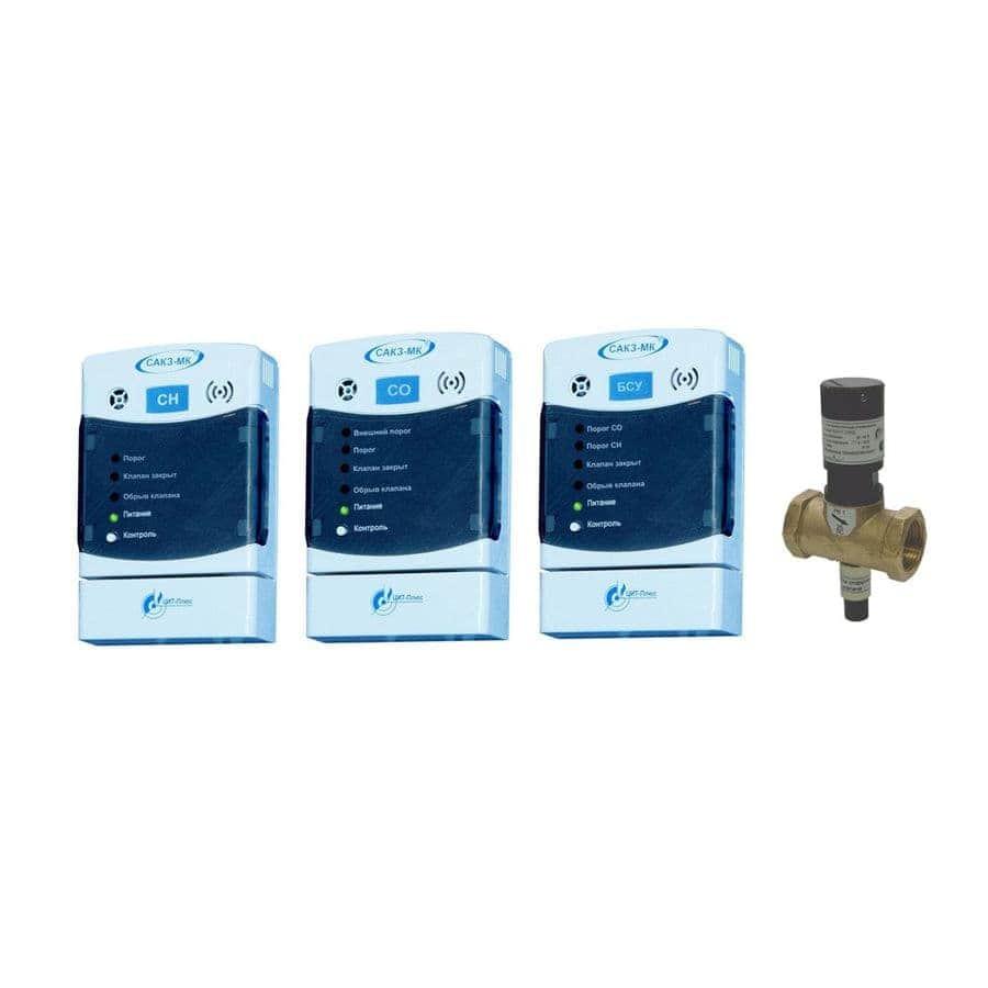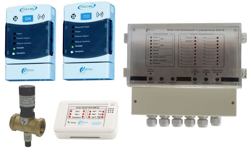 - САКЗ-МК-3 состоит из сигнализатора СЗ-1 (природный газ) или СЗ-3 (сжиженный газ), сигнализатора СЗ-2 (оксид углерода); блока сигнализации и управления БСУ-К, клапана КЗЭУГ или КЗГЭМ-У (DN = 15÷150, PN — до 0,4 МПа) и диспетчерского пульта ПД.