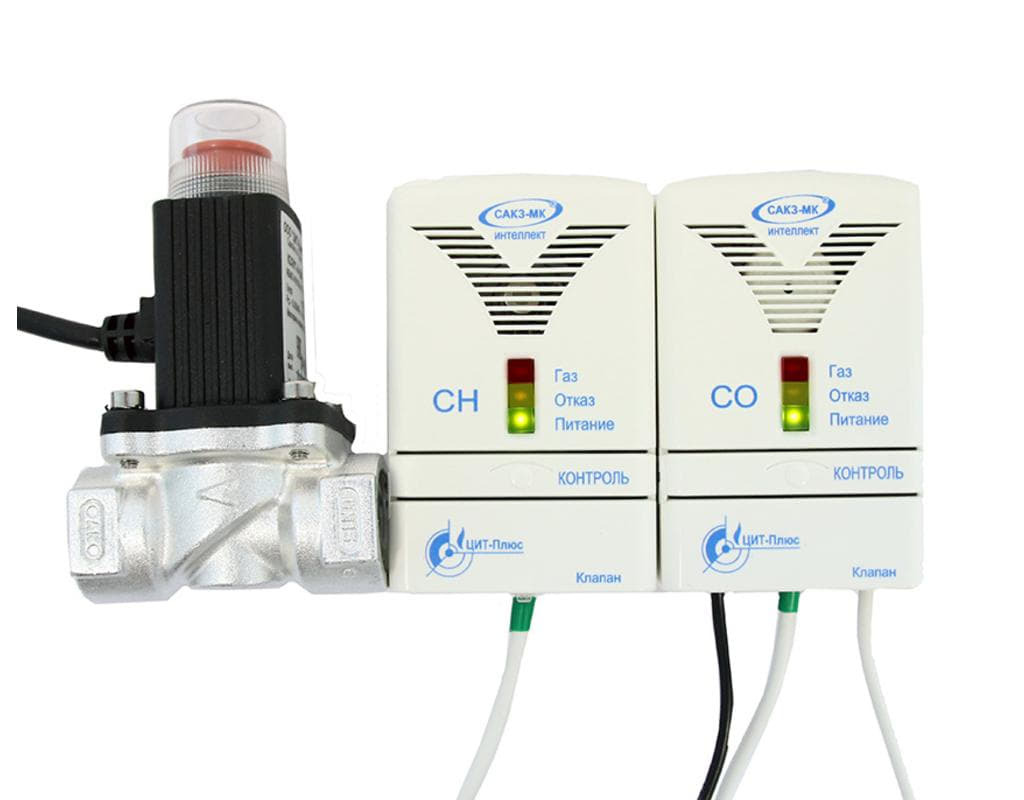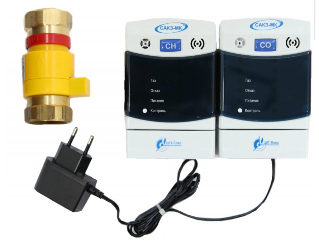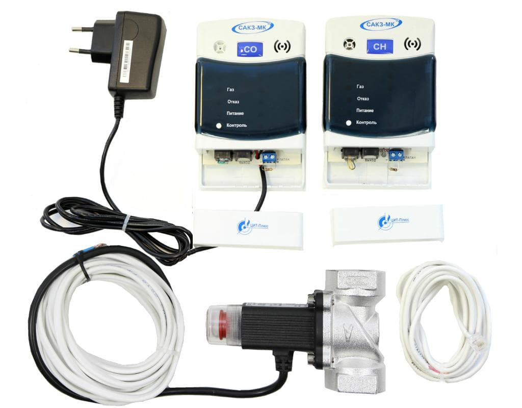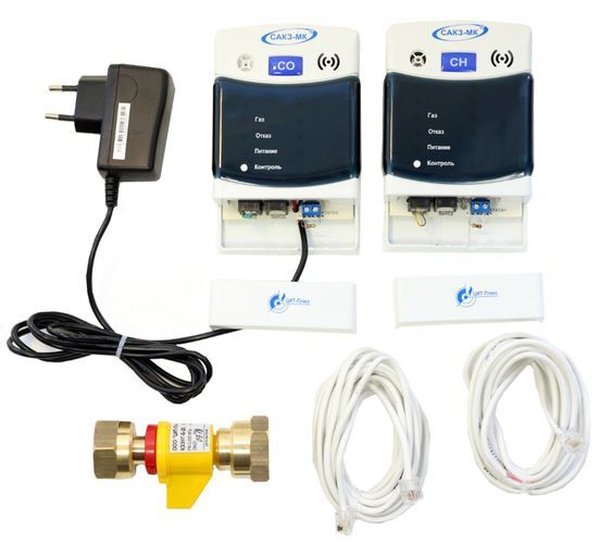 - САКЗ-МК-2 состоит из сигнализатора загазованности и БСУ в ударопрочном пластмассовом корпусе, клапана запорного с импульсным управлением и кабеля клапана протяжённостью 10 м (по заказу до 20м);