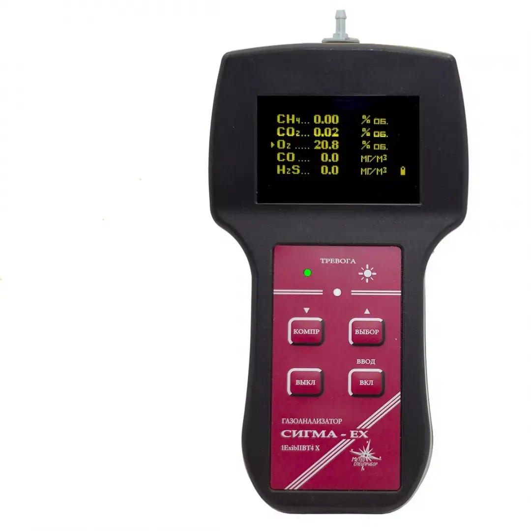 Серийно изготавливаемый портативный многокомпонентный газоанализатор СИГМА-ЕХ предназначен для контроля содержания кислорода, взрывоопасных и токсичных газов в воздухе рабочей зоны. Применяется для контроля воздуха в закрытых помещениях и на открытых площадках. В зависимости от установленных сенсоров прибор может контролировать от 1 до 5 измеряемых веществ. В газоанализатор устанавливаются электрохимические и оптические (инфракрасные) сенсоры. Анализатор обладает высокой степенью защиты оболочки (IP65) и взрывозащищенным исполнением «Искробезопасная цепь» 1Ex ib IIB T4 Х. В корпус оборудования установлен насос для осуществления принудительной подачи газовой пробы на сенсоры. Для проведения измерений в труднодоступных местах газоанализатор СИГМА-ЕХ оснащён зондом отбора пробы. В зависимости от установленных сенсоров прибор может иметь более 100 исполнений. Изделие выполнено в климатическом исполнении УХЛ 3.1.